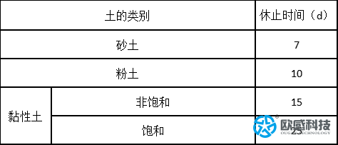 注意:對于泥漿護壁灌注樁,宜適當(dāng)延長休止時間。當(dāng)采用后注漿施工工藝時,注漿后休止時間不宜少于20d。
