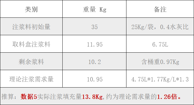 注漿用量:推算理論注漿需求量為11.2Kg(4.75L*1.81Kg/L*1.3 這里選取充盈率為1.3)
