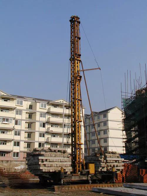 打入樁是通過(guò)錘擊將預(yù)制樁沉入地基。此種施工方法適用于樁徑較?。ㄒ话銟稄?.6m以下),地基土土質(zhì)為可塑性粘狀土、砂性土、粉土、細(xì)砂以及松散的碎卵石類土的情況。