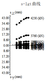 樁號 E1-65#,樁徑1.0m,樁長:30.4米,沖擊鉆成孔,荷載箱埋設(shè)樁端上2米,單樁豎向極限承載力:9334KN,荷載箱加載噸位:4700KN;實際檢測過程中荷載值加載到4230KN,上段樁樁身向上整體滑動,上位移平均位移:42.78mm,下位移平均位移:5.20mm,如下表3附具體測試位移數(shù)據(jù),附具體曲線圖。